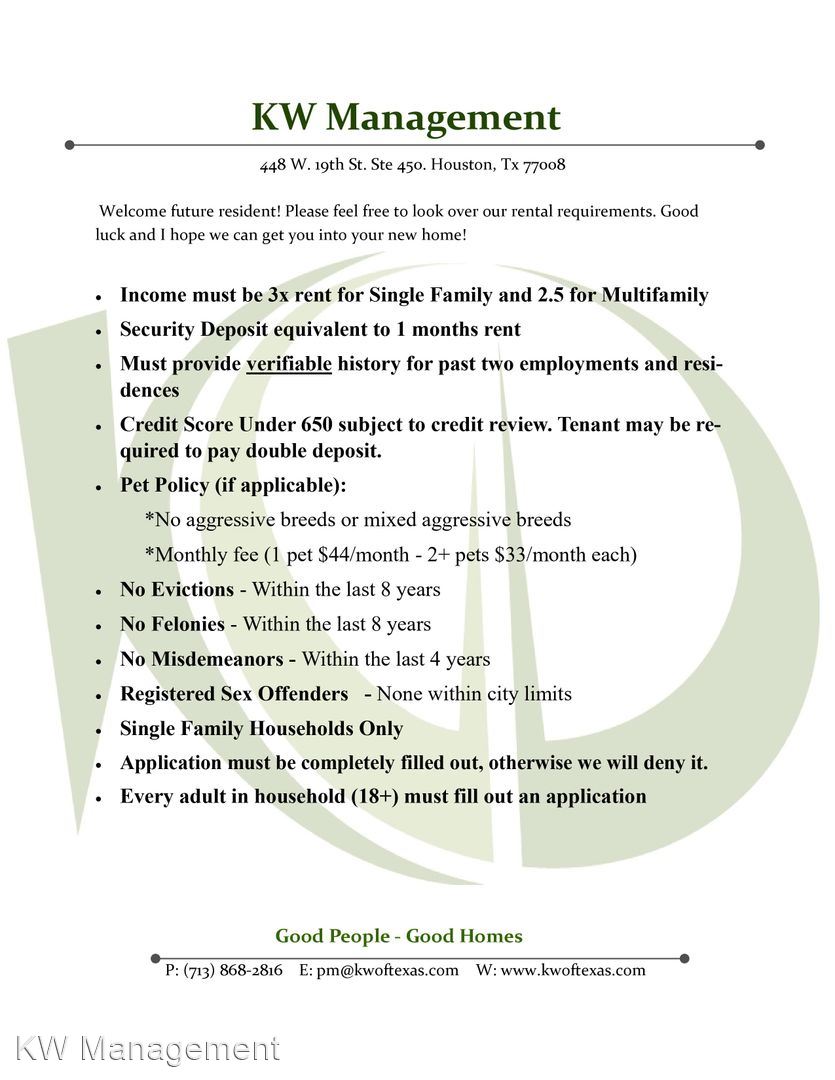 Move in Ready 2 Bed / 1 Bath in 77041! - We recently did some updating on this great little home on the North West side of Houston, Tx. Fresh paint, nice kitchen, spacious rooms and great back yard. This house is conveniently located near 290, Sam Houston Tollway and Energy corridor, major shopping centers and Bear Creek Pioneers Park. -Have a look at our rental criteria, its the last few pics on the listing. Feel free to email or call us to schedule a tour. Our rentals dont last, we are below market rents and have great management! -Our 2-year leases afford you peace of mind that your rent is locked into today's rates. -Hablamos español, les ayudamos a calificar para su alquiler. https://my.matterport.com/show/?m=MJLQmSrQLbg&brand=0